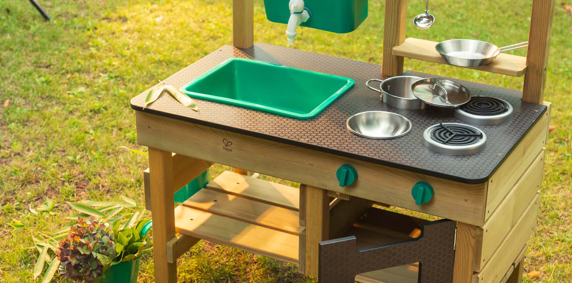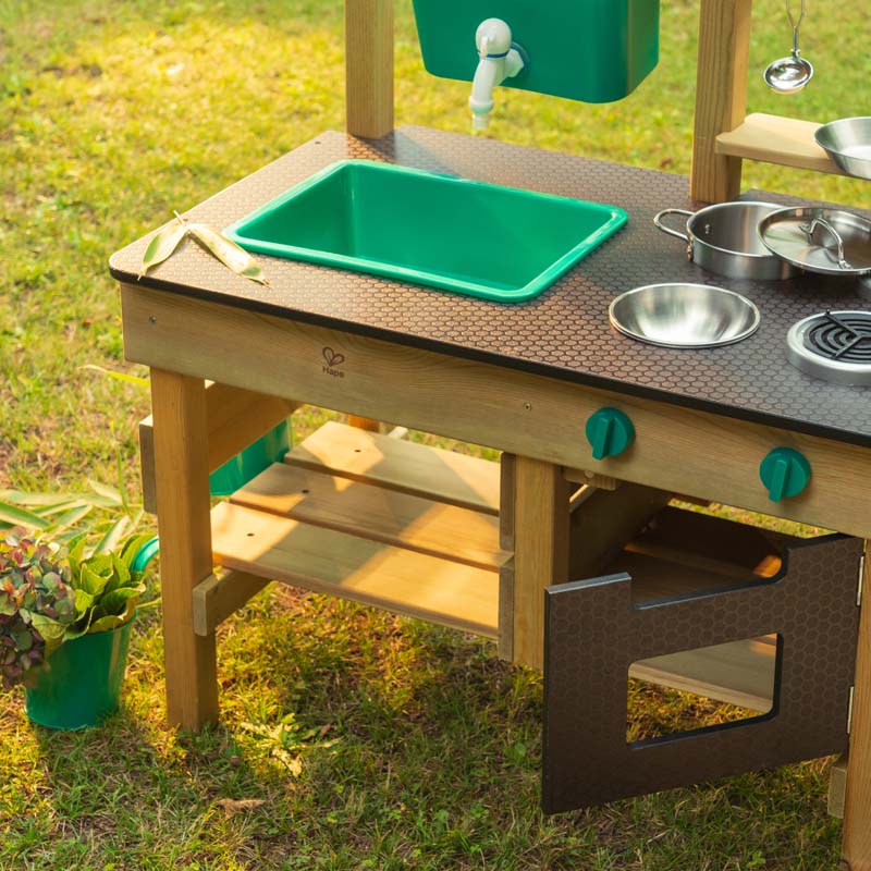 Whether you're cooking with mud, stones, and water or even leaves and pine cones. If you have a green thumb, you can use the plant pots to grow your own flowers, fruits or vegetables! Whatever mess you enjoy creating in the great outdoors, this kitchen has everything and more.