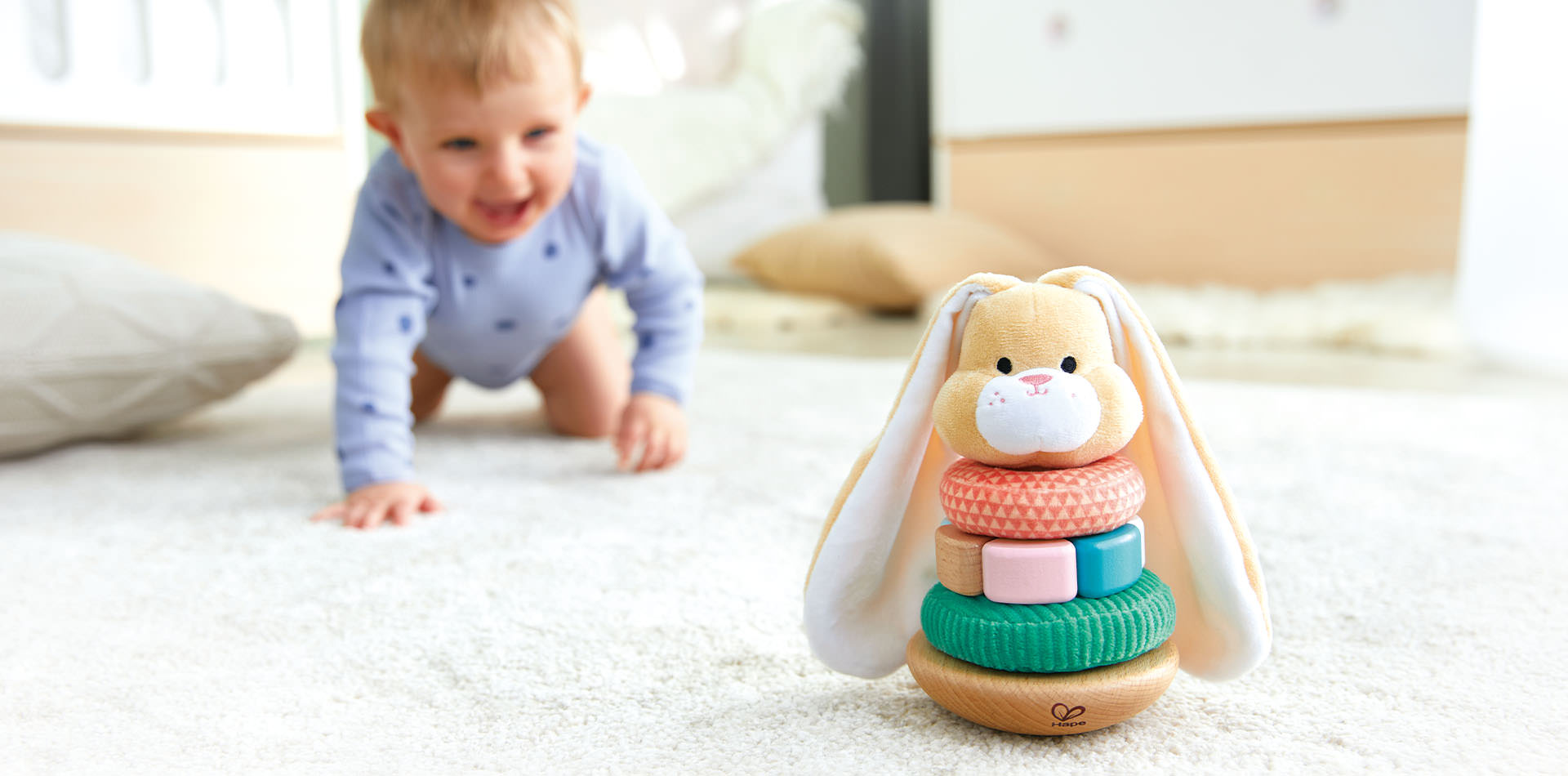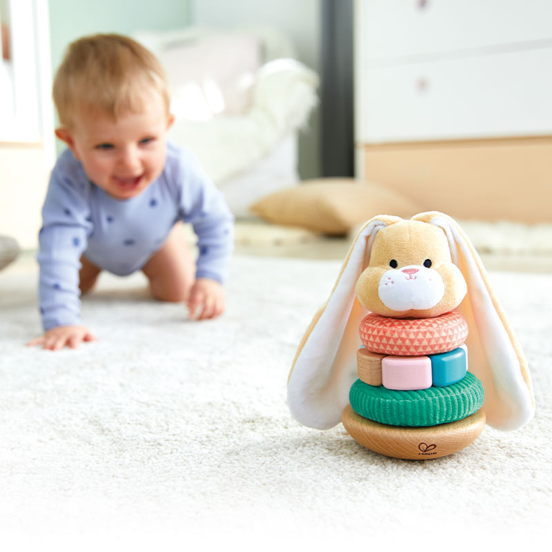 This cute stacking long-eared rabbit brings a smile to the youngest's face. The toy consists of five parts - a wooden base made of beech, three stacking rings with different materials that the child can feel and a top with a fluffy long-eared bunny head. One of the stacking rings has a cute pom-pom tail that also serves as a pull-back strap and makes fine, bright-sounding clicking noises.