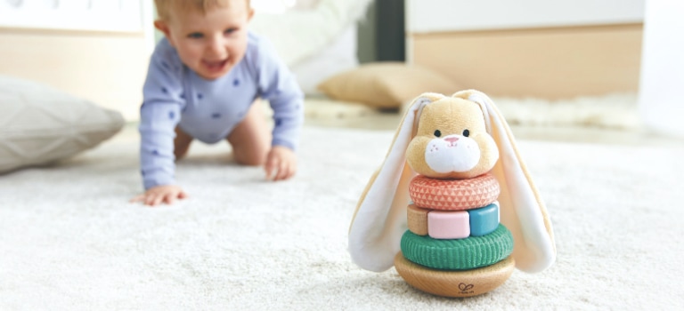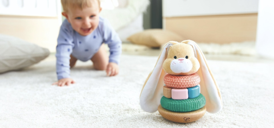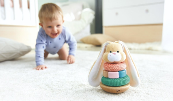 This cute stacking long-eared rabbit brings a smile to the youngest's face. The toy consists of five parts - a wooden base made of beech, three stacking rings with different materials that the child can feel and a top with a fluffy long-eared bunny head. One of the stacking rings has a cute pom-pom tail that also serves as a pull-back strap and makes fine, bright-sounding clicking noises.