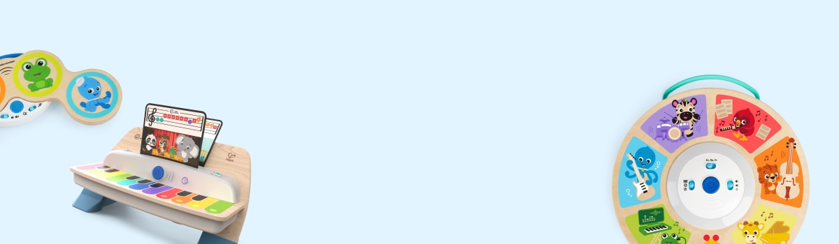 with the Notes & Keys™ Magic Touch™ Keyboard from Baby Einstein. Made with award-winning Magic Touch technology, this wooden toy puts music at baby’s fingertips… with no buttons or keys required! The portable design of this keyboard toy makes it easy to bring self-expression wherever you go, and it stows neatly away when not in use. The musical possibilities are endless in Freeplay mode, and baby can switch between piano, xylophone, hip hop and drum sounds. Our Play Assist technology helps baby discover a new song by following the lights, and Silly Mode activates sound effects galore. This developmental toddler toy introduces color and music notes while exploring cause and effect through sound. Your budding musician will be amazed at the way their fingers or toes can make music happen with just a tap!