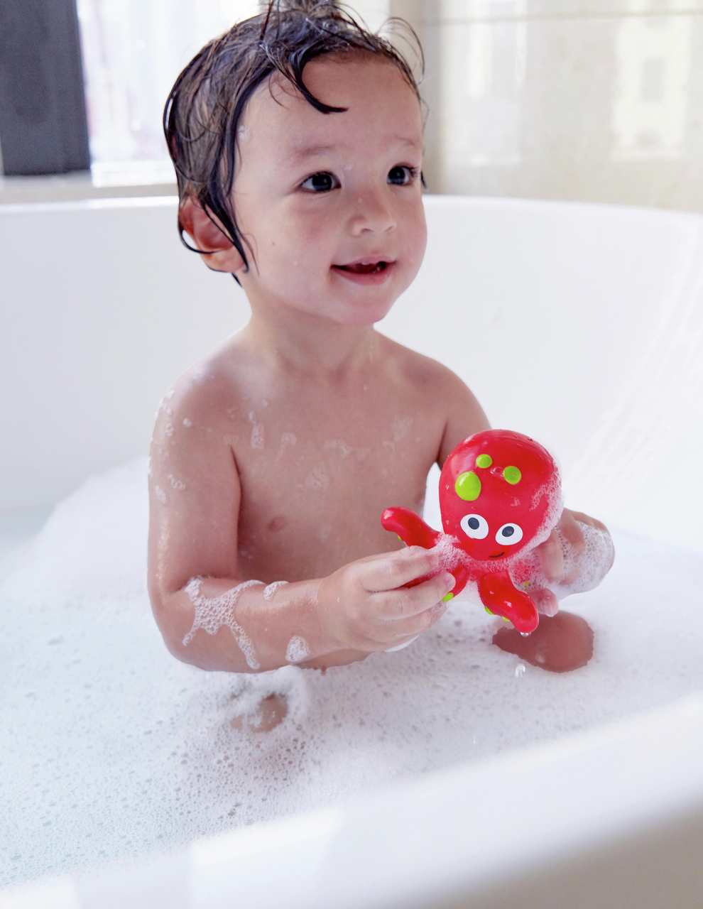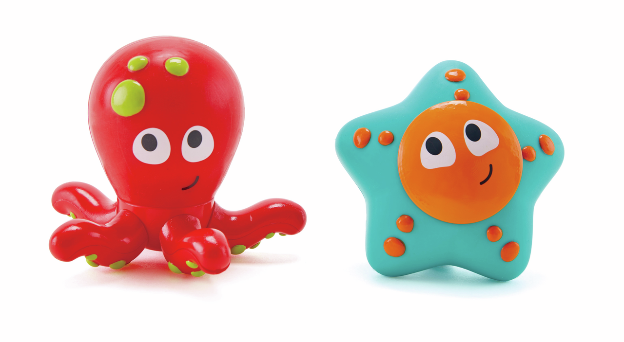 This cute octopus and starfish have a cheeky secret! If you fill them up with water and squeeze them they will shoot out water. Brings splashy fun to bath time!